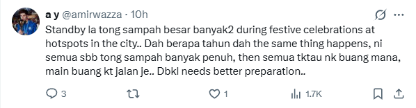 According to netizen @amirwazza who followed the post, the authorities should provide more rubbish bins at hotspots during the festive celebration.