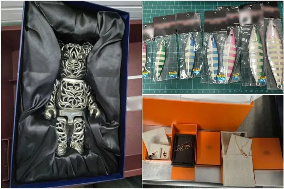 (Clockwise from left) A pewter Bearbrick collectible figurine, fishing lures intended for commercial purposes, and luxury bags and jewellery were among the undeclared items offenders tried to bring into Singapore. -- PHOTOS: SINGAPORE CUSTOMS via The Straits Times/ANN