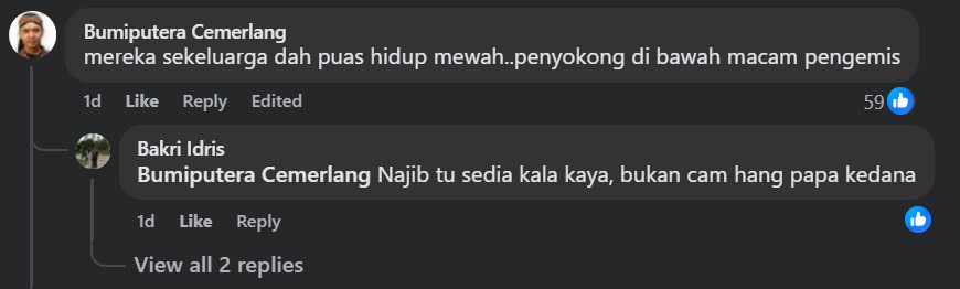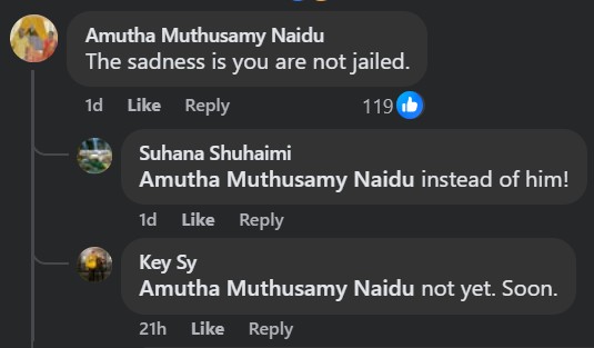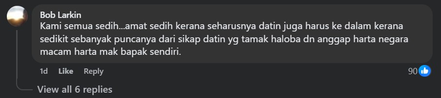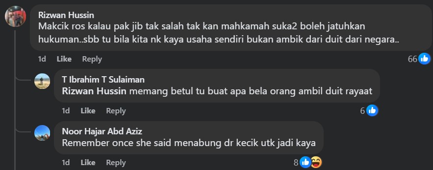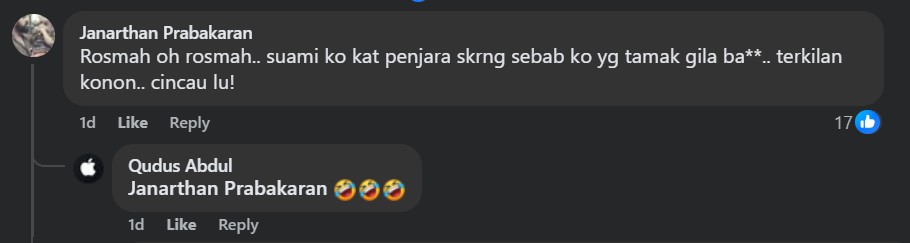 On Harian Metro’s Facebook page, the reaction was equally damning with plenty of commenters mocking the 74-year-old for even daring to suggest she and her family deserve empathy. One way is to accompany her husband in prison, teased one commenter.