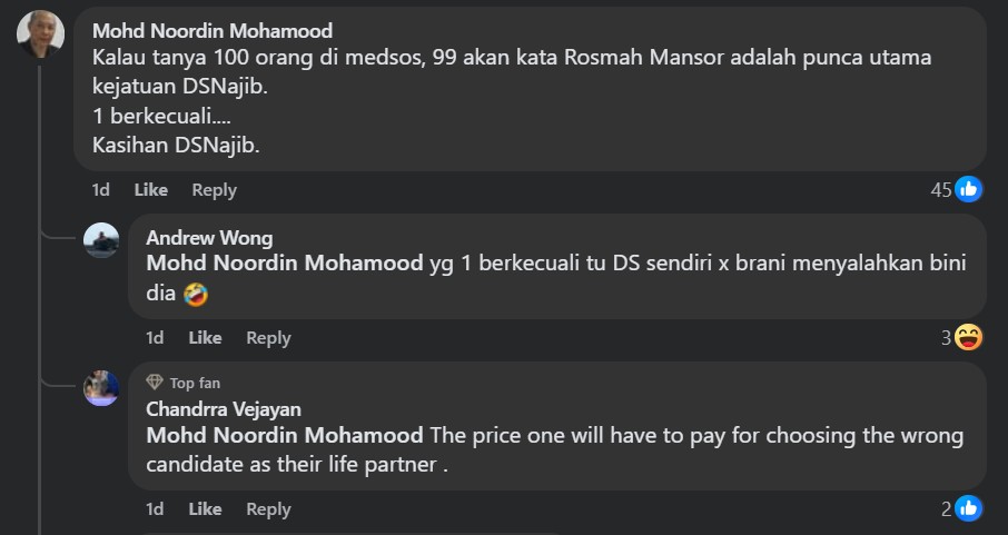 This was when some commenters brought up the leaked phone conversation between Rosmah and her husband that cast her as domineering queen figure that was calling the shots.