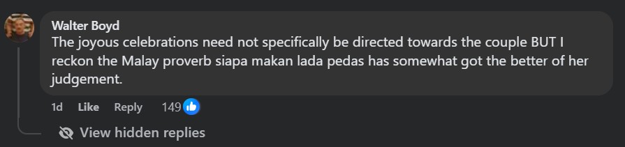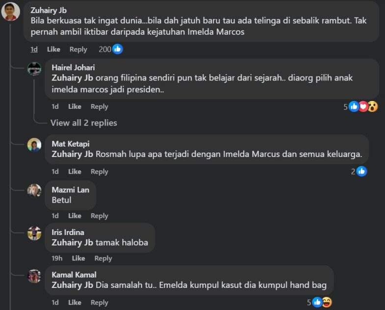 On Lumi News Facebook site, the same sentiments were being echoed by various commenters. One argued that the celebrations were not directed at the couple’s misfortune specifically but was taken to heart by Rosmah as those “who eat chilis will feel the heat”.