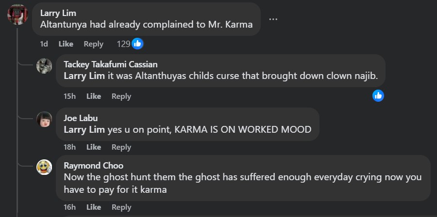 More than one commenter brought up the ghost of Shaariibuugiin Altantuya. The murder of the Mongolian model has continued to be linked to Najib and Rosmah though there have been no criminal proceedings on this matter. This was karma, professed a few observers.