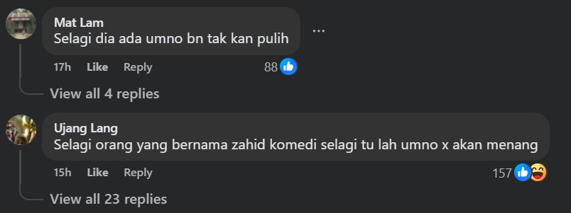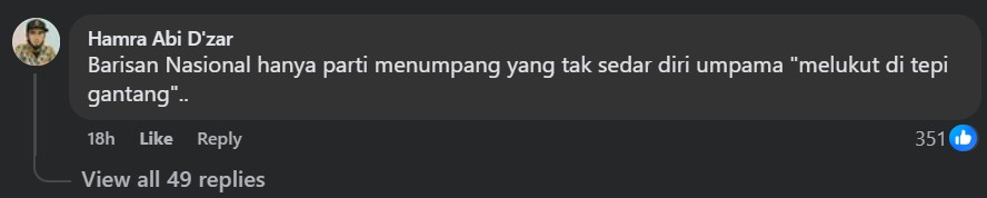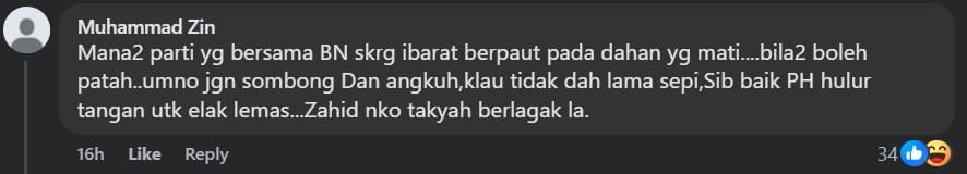 One commenter even described BN as “just a ride-hailing party that is unaware of itself picking at the edge of a bushel” while others contended that “the woes of BN wouldn’t recover with Zahid around” nor “would UMNO win (in an election)”.