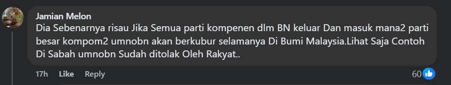 “UMNO shouldn’t be arrogant and conceited … thankfully, PH (Pakatan Harapan) has extended a hand to prevent you guys from drowning,” sounded one commenter.