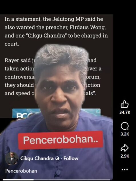As reported by Free Malaysia Today (FMT) the Jelutong MP had called for the arrest of the the Multiracial Reverted Muslims (MRM) president and TikToker Cikgu Chandra over their alleged provocative social media posts regarding a Hindu temple