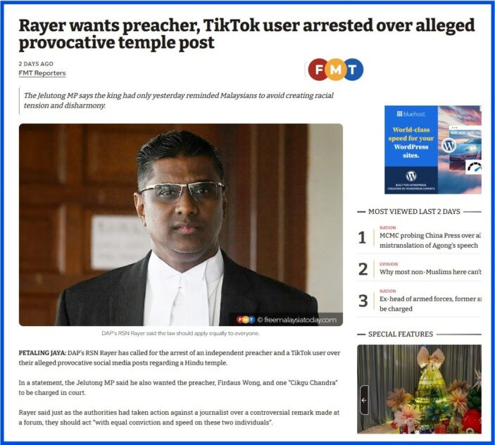 This seems to be the query among some Muslim commenters who are deeply unhappy that DAP lawmaker RSN Rayer had called on the authorities to act against controversial Muslim convert preacher Firdaus Wong Wai Hung and citizen activist S. Chandrasegaran a.k.a. Cikgu Chandra for allegedly stirring the 3R (race, religion and royalty) pot.