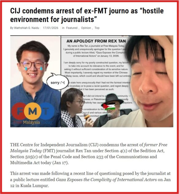 A journalist from Free Malaysia Today (prior to his eventual resignation) was hauled up by the cops in the middle of the night over a question which is said to have carried racial overtones at a lecture on Gaza which featured British politician George Galloway.