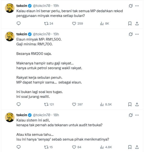 SUCH is the proposal of self-proclaimed satirist tokcin (@tokcin70) as the social media is abuzz with calls for the Madani administration to temporarily slash the fuel allowances of government MPs, ministers and their deputies as well senior civil servants and that of chairman/board members of government-linked companies (GLCs)/agencies.