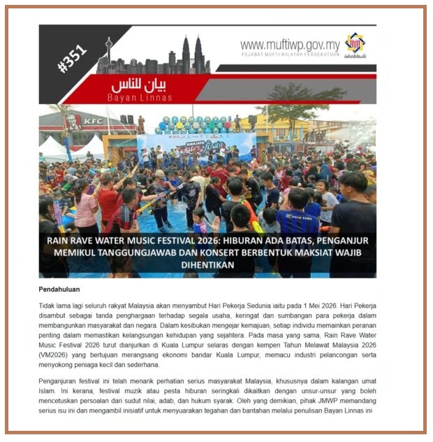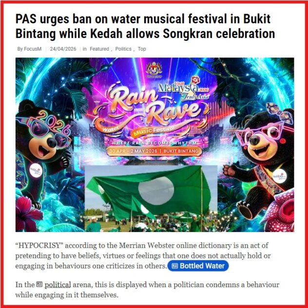 One wonders if the statement is merely a PR (public relations) exercise to pacify PAS-led rightist groups who has since day one been opposing the three-day Tourism, Arts and Culture Ministry (MOTAC)-backed Rave Water Music Festival 2026 which commences today (April 30).