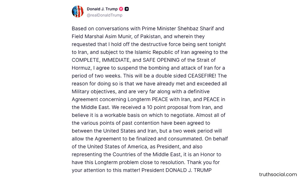 US President Donald Trump said earlier that Washington would suspend attacks on Iran for two weeks, describing Tehran’s proposal as a “workable basis” for negotiations.