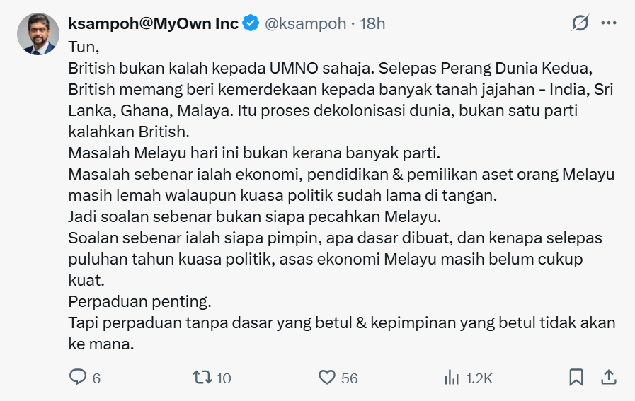 Then there was @ksampoh pointing out that UMNO never beat the British, that the process of world decolonisation happened. India, Sri Lanka, and Ghana received independence too.